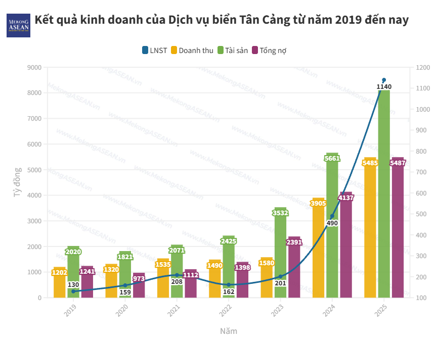 Năm 2025, nhiều doanh nghiệp cảng biển ghi nhận mức tăng trưởng tích cực về doanh thu và lợi nhuận. Trong đó, Dịch vụ biển Tân Cảng dẫn đầu về tốc độ tăng trưởng, với doanh thu và lãi sau thuế lần lượt tăng 40% và 133% so với năm 2024.
