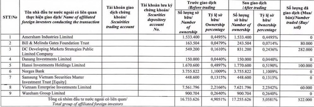 Theo đó, trong phiên giao Dragon Capital vừa thông qua 4 quỹ thành viên để mua vào tổng cộng 522.000 cổ phiếu PNJ. Cụ thể, quỹ Bill & Melinda Gates Foundation Trust mua 80.000 cổ phiếu; quỹ DC Developing Markets Strategies Public Limited Company mua 282.000 cổ phiếu; quỹ Hanoi Investments Holdings Limited mua 100.000 cổ phiếu và quỹ Vietnam Enterprise Investments Limited mua 60.000 cổ phiếu.