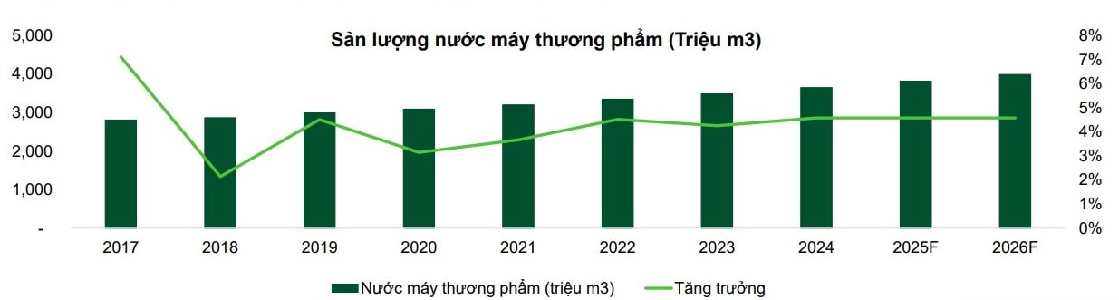 VCBS cho rằng sản lượng nước sạch thương phẩm tại Việt Nam có xu hướng tăng trưởng dài hạn và ổn định nhờ: Nhu cầu nước sạch cho sản xuất gắn liền với tăng trưởng GDP; Nhu cầu nước sạch cho sinh hoạt gia tăng cùng pha với chu kỳ dân số và tỷ lệ đô thị hóa ngày càng cao.