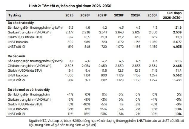 Vietcap dự báo LNST năm 2026 của NT2 đạt khoảng 1.100 tỷ đồng (+10% YoY), được thúc đẩy bởi sản lượng tăng lên 4,6 tỷ kWh (+46% YoY), chi phí khấu hao giảm khoảng 390 tỷ đồng, ghi nhận khoảng 155 tỷ đồng bồi thường lỗ tỷ giá và thu nhập tài chính tăng 34% YoY, dù thuế suất tăng gấp đôi lên 20%.