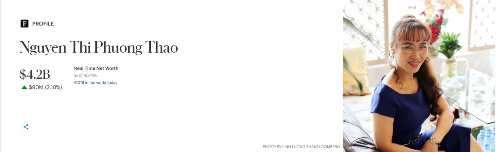 Trên bảng xếp hạng theo thời gian thực của Forbes, tại ngày 24/4, bà Nguyễn Thị Phương Thảo là người giàu thứ 2 Việt Nam chỉ sau tỷ phú Phạm Nhật Vượng với khối tài sản 4,2 tỷ USD và xếp hạng 1.018 trên thế giới.