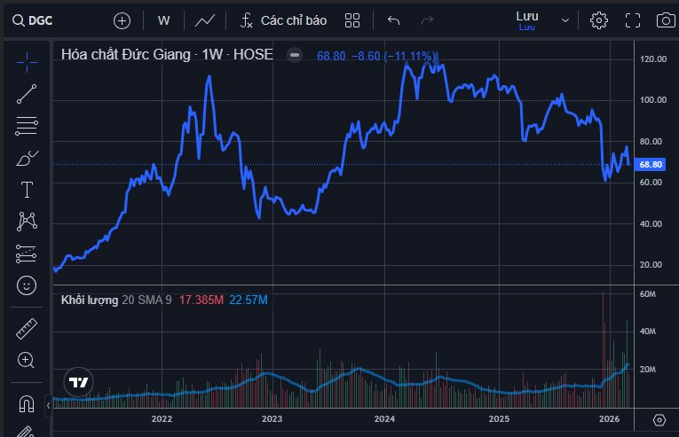 Trên thực tế, sau nhiều đợt chia cổ tức bằng cổ phiếu khiến giá bị pha loãng, DGC không thể quay lại vùng đỉnh cũ. Từ cuối năm 2025, trước các thông tin bất lợi và tin đồn liên quan đến hoạt động doanh nghiệp, cổ phiếu bắt đầu rời đỉnh và bước vào xu hướng điều chỉnh kéo dài, xen kẽ nhiều phiên giảm sàn gây bất ngờ cho thị trường. Dù có những nhịp hồi phục ngắn, xu hướng chung vẫn suy yếu.
