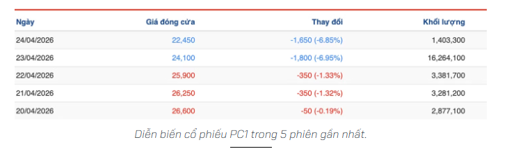 Cổ phiếu PC1 của CTCP Tập Đoàn PC1 gây chú ý khi phiên 23/4 thanh khoản tăng vọt lên hơn 16,2 triệu cổ phiếu, nhưng hôm nay (24/4) chỉ còn hơn 1,4 triệu đơn vị.