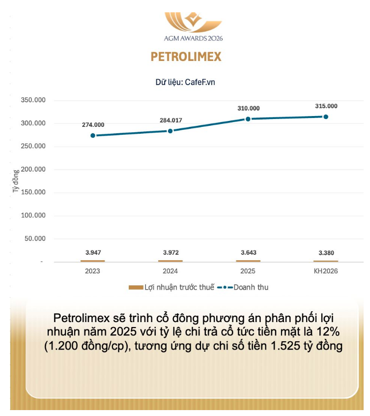 Cũng tại Đại hội sắp tới, Petrolimex sẽ trình cổ đông phương án phân phối lợi nhuận năm 2025 với tỷ lệ chi trả cổ tức tiền mặt là 12% (1.200 đồng/cp), tương ứng dự chi số tiền 1.525 tỷ đồng. Tỷ lệ cổ tức năm 2026 dự kiến sẽ là 10%.