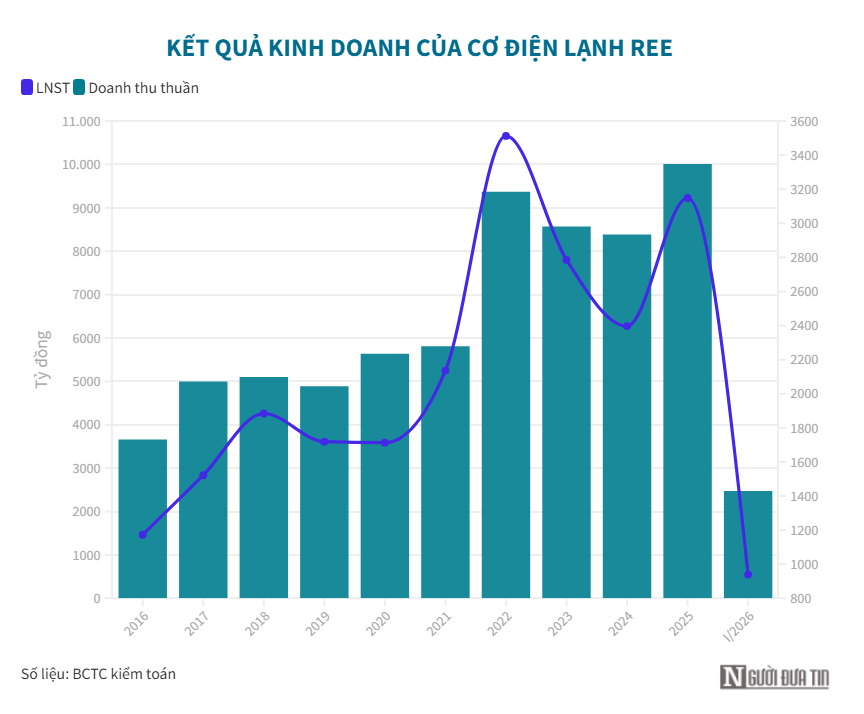 Năm 2026, REE đặt mục tiêu doanh thu hợp nhất 12.230 tỷ đồng và lợi nhuận sau thuế khoảng 2.814 tỷ đồng, lần lượt tăng 22% và hơn 11% so với thực hiện năm 2025. Với kết quả đạt được, doanh nghiệp đã hoàn thành khoảng 20% kế hoạch doanh thu và hơn 1/3 mục tiêu lợi nhuận cả năm.