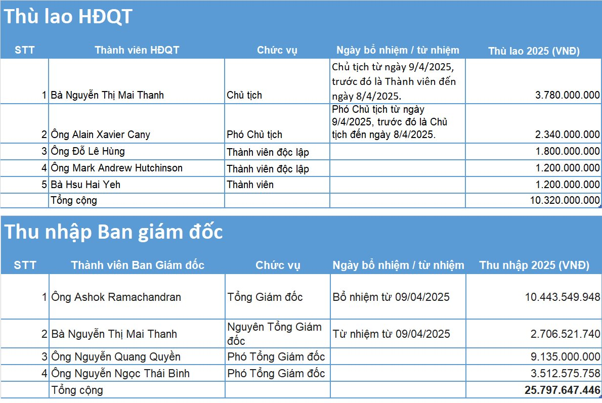 Phó Chủ tịch Alain Xavier Cany (bổ nhiệm ngày 9/4/2025) nhận mức thù lao 2,34 tỷ đồng trong năm 2025.