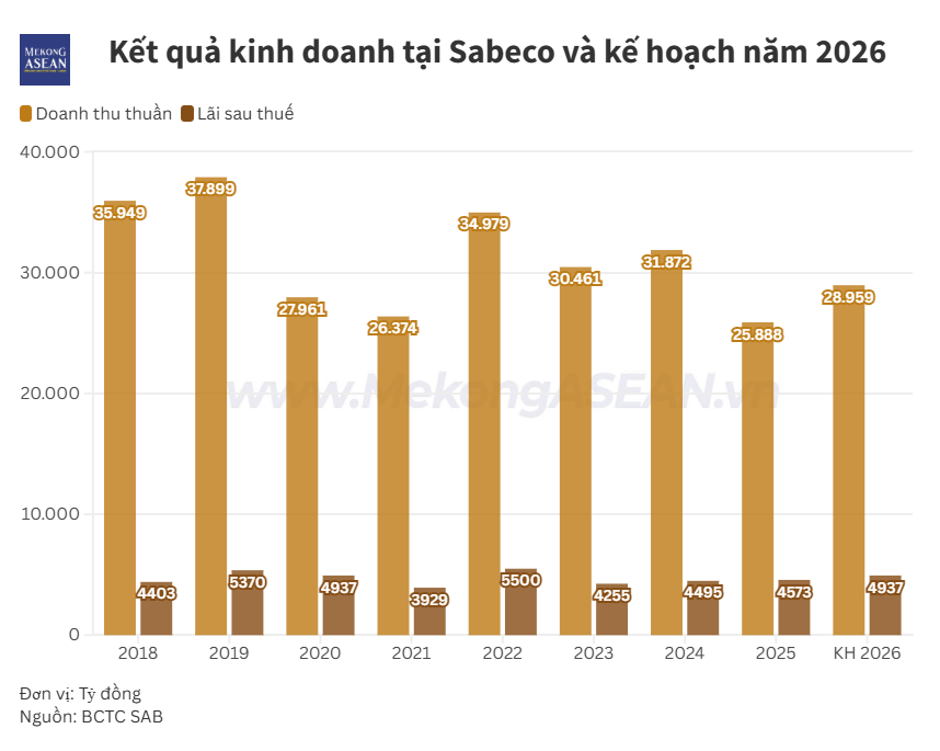 Tại Đại hội đồng cổ đông thường niên của Tổng Công ty CP Bia - Rượu - Nước giải khát Sài Gòn (Sabeco, mã: SAB) ngày 23/4, cổ đông doanh nghiệp đã thông qua mục tiêu doanh thu năm 2026 đạt 28.959 tỷ đồng, tăng 12% so với năm 2025 (YoY) và lợi nhuận sau thuế ở mức 4.937 tỷ đồng, tăng 8% YoY.