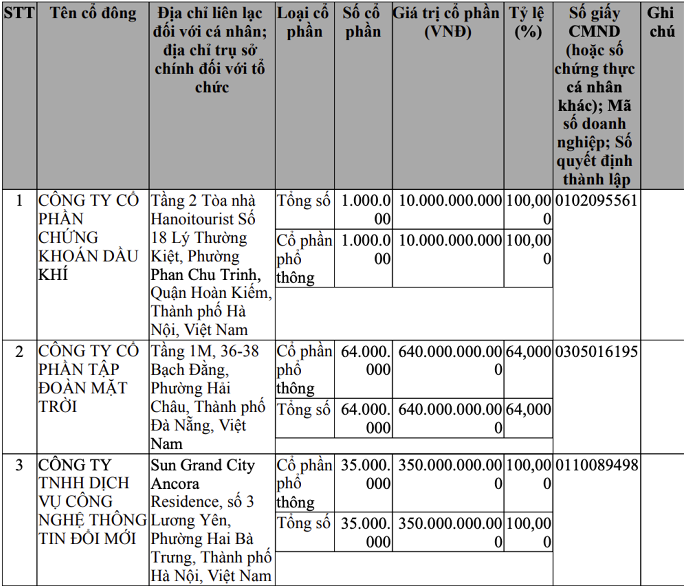 Công ty có vốn điều lệ ban đầu 1.000 tỷ đồng. Trong đó, cổ đông lớn nhất là Công ty cổ phần Tập đoàn Mặt Trời (Sun Group) với tỷ lệ góp vốn 64%, tương đương 640 tỷ đồng. Công ty TNHH Dịch vụ Công nghệ thông tin Đổi mới nắm giữ 35% vốn, trong khi Công ty cổ phần Chứng khoán Dầu khí sở hữu 1% còn lại.