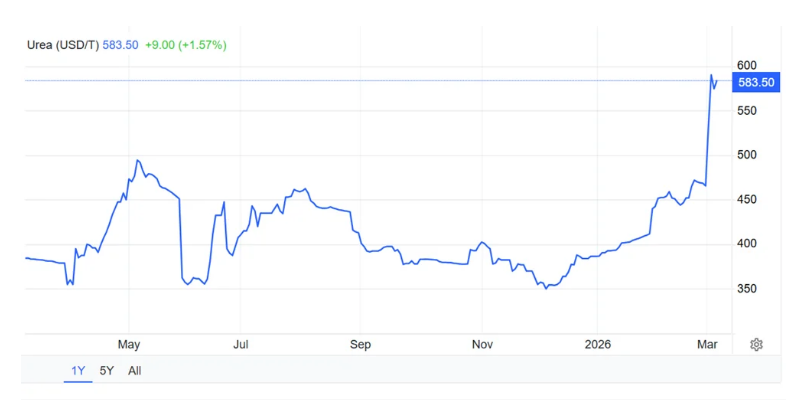 Điều này kéo theo giá phân bón ure đã tăng vọt. Giá ure tương lai trên Sở Giao dịch Chicago hiện đã lên 583,5 USD/tấn, tăng 29% trong 1 tháng qua và tăng 52,2% so với cùng kỳ năm trước.