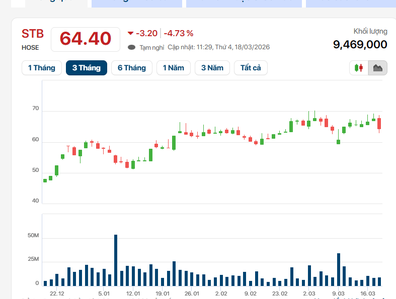 Phản ứng trên thị trường chứng khoán diễn ra khá nhanh. Trong phiên sáng 18/03, cổ phiếu STB giảm 4,7% xuống 64.400 đồng/cp và có thời điểm giảm kịch sàn về 62.900 đồng/cp, với thanh khoản gần 9,5 triệu đơn vị.
