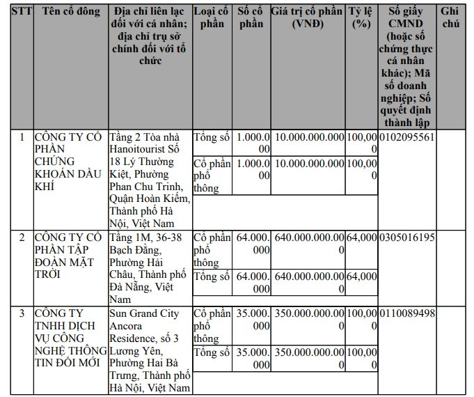 Công ty có vốn điều lệ ban đầu 1.000 tỷ đồng. Trong đó, cổ đông lớn nhất nắm tỷ lệ chi phối là CTCP Tập đoàn Mặt Trời (Sun Group) với tỷ lệ góp vốn 64%, tương đương 640 tỷ đồng. Công ty TNHH Dịch vụ Công nghệ thông tin Đổi mới nắm giữ 35% vốn, trong khi CTCP Chứng khoán Dầu khí (mã: PSI) sở hữu 1% còn lại.