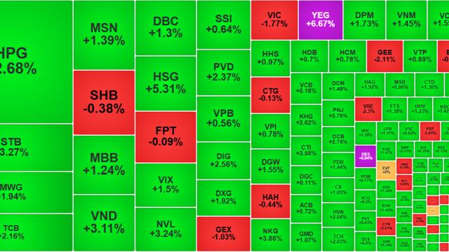 VIC đang lao dốc 1,77%, VHM giảm 0,83% và VRE giảm 2,3% khiến VN-Index mất khoảng 2,3 điểm. Phía ngược lại TCB tăng 2,16%, HPG tăng 2,68% và STB tăng 3,27% bù lại 2,7 điểm. Phần tăng còn lại của chỉ số là nhờ diễn biến tăng áp đảo.