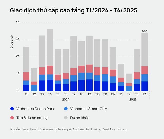 Cụ thể, trong tháng 4/2025 tổng giao dịch thứ cấp toàn thị trường đạt khoảng 7.600 căn, tăng 67% so với tháng 3, và cao hơn mức trung bình toàn thị trường (6.150 căn/tháng).