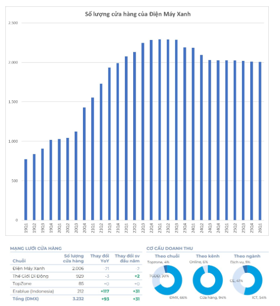 Tiếp đà hưng phấn, quý 1/2026 DMX ghi nhận doanh thu đạt 32.416 tỷ đồng, tăng trưởng mạnh mẽ 33% so với cùng kỳ và hoàn thành sớm 26% kế hoạch năm. Đáng chú ý, chỉ số tăng trưởng doanh thu trên mỗi cửa hàng hiện hữu (SSSG) đạt mức ấn tượng 34%, cho thấy hiệu suất khai thác cực cao mà không cần áp lực mở mới cửa hàng. Sự tăng trưởng ghi nhận sự đồng đều ở tất cả các ngành hàng chiến lược.