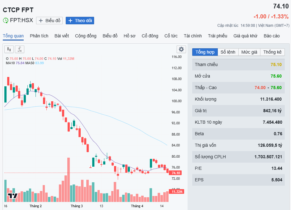 Giá cổ phiếu FPT đã giảm 23% kể từ đầu năm 2026 và mất tới gần 44% từ đỉnh lịch sử tháng 1/2025