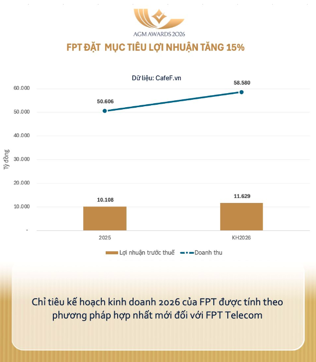 Tại Đại hội, FPT sẽ trình cổ đông kế hoạch kinh doanh năm 2026 với mục tiêu doanh thu đạt 58.580 tỷ đồng, tăng 15,8% so với thực hiện năm 2025. Lợi nhuận trước thuế dự kiến đạt 11.629 tỷ đồng, tăng 15% so với năm trước (theo phương pháp hợp nhất mới đối với FPT Telecom).