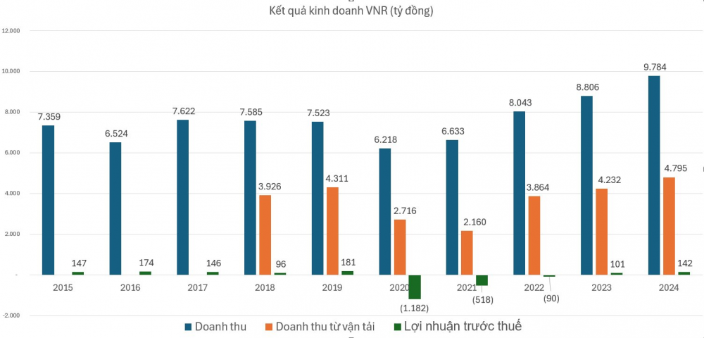 Tuy có doanh thu gần mốc 10.000 tỷ đồng, lợi nhuận trước thuế của VNR năm 2024 chỉ ở mức khiêm tốn 142,5 tỷ đồng, tương đương mức biên lợi nhuận khoảng 1,45%.