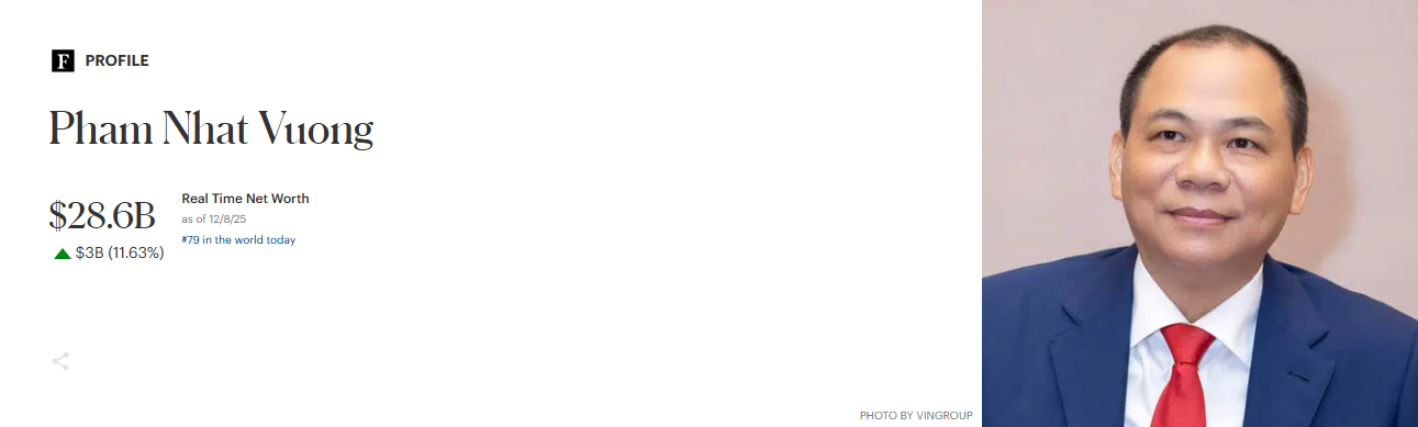 Tỷ phú Phạm Nhật Vượng lọt TOP 80 người giàu nhất Trái Đất