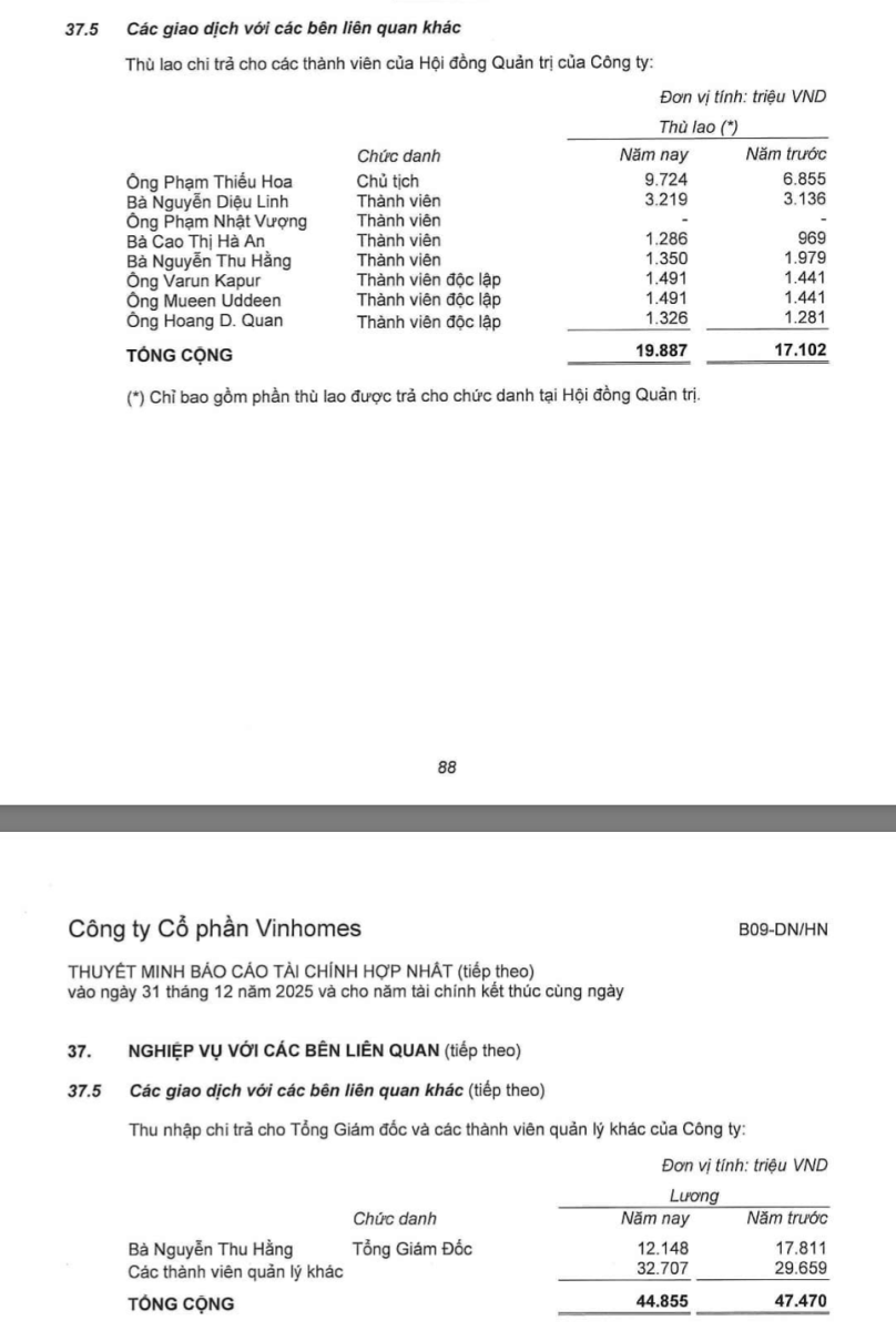 Chủ tịch HĐQT Phạm Thiếu Hoa nhận khoảng 9,7 tỷ đồng, cao hơn đáng kể so với khoảng 6,9 tỷ đồng cùng kỳ. Các thành viên HĐQT khác có mức thù lao dao động từ khoảng 1,3 - 3,2 tỷ đồng/người. Tương tự công ty mẹ, báo cáo cũng không ghi nhận thù lao đối với ông Phạm Nhật Vượng trong vai trò thành viên HĐQT.