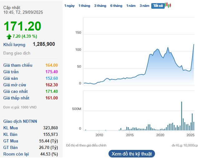 Thị trường chứng khoán phiên giao dịch đầu tuần tiếp tục chứng kiến đà “nhấn ga” tăng tốc của cổ phiếu Vingroup. Tính tới thời điểm 10h45p, cổ phiếu Vingroup (mã: VIC) đang giao dịch ở mức 171.200 đồng/cp, tương ứng tăng gần 4,4% qua đó lập đỉnh lịch sử. Tính từ đầu năm, cổ phiếu này đã tăng tới hơn 300%.