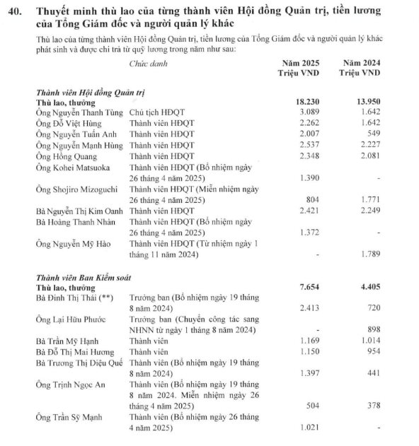 Ở cấp quản trị, tổng thù lao Hội đồng Quản trị năm 2025 đạt 18,23 tỷ đồng, tăng 4,28 tỷ đồng so với năm trước, tương ứng tăng khoảng 30,7%.