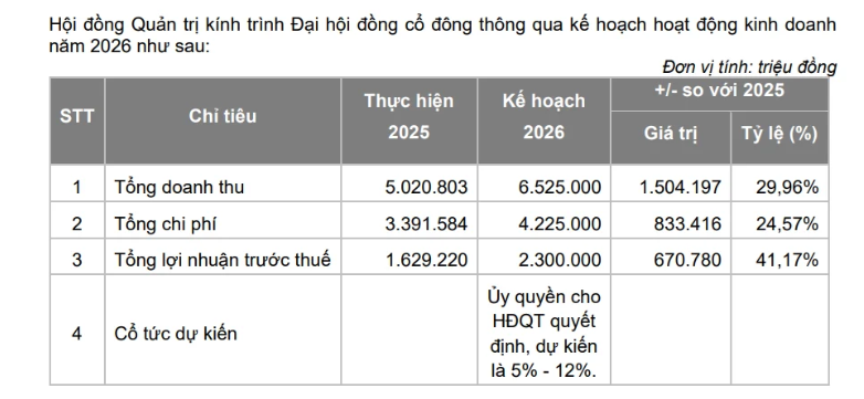 Về chính sách cổ tức, công ty đã thực hiện tạm ứng đợt 1/2025 tỷ lệ 5% vào đầu năm và dự kiến còn đợt nữa bằng tiền mặt tỷ lệ 2,5% (tính trên vốn điều lệ trước khi thực hiện thưởng cổ phiếu 35%). Cổ tức năm 2026 dự kiến tỷ lệ từ 5% đến 12%.