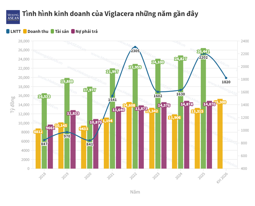 Sang năm 2026, Viglacera lên kế hoạch kinh doanh với tổng doanh thu hợp nhất đạt 15.300 tỷ đồng, tăng trưởng 15% so với năm 2025; tuy nhiên, lợi nhuận trước thuế hợp nhất lại giảm 17% về còn 1.820 tỷ đồng. Tỷ lệ chia cổ tức bằng tiền dự kiến giảm về 10% trong năm 2026, so với 22% của năm 2025.