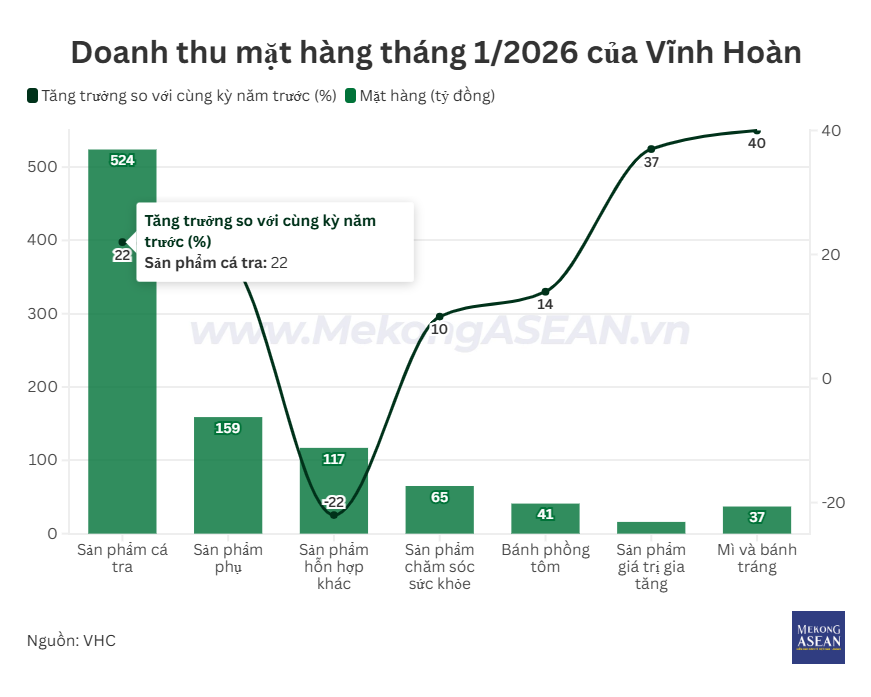 Chấm dứt chuỗi giảm liên tiếp, tháng đầu năm 2026, doanh thu của Vĩnh Hoàn (VHC) lội ngược dòng với mức tăng trưởng 13% so với cùng kỳ.