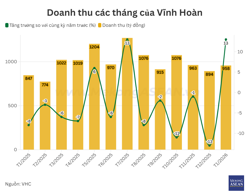 Theo số liệu kinh doanh công bố ngày 24/2 của CTCP Vĩnh Hoàn (HoSE: VHC), tháng 1/2026, doanh thu của doanh nghiệp này đã tăng 13% so với cùng kỳ năm trước (YoY), lên 958 tỷ đồng.