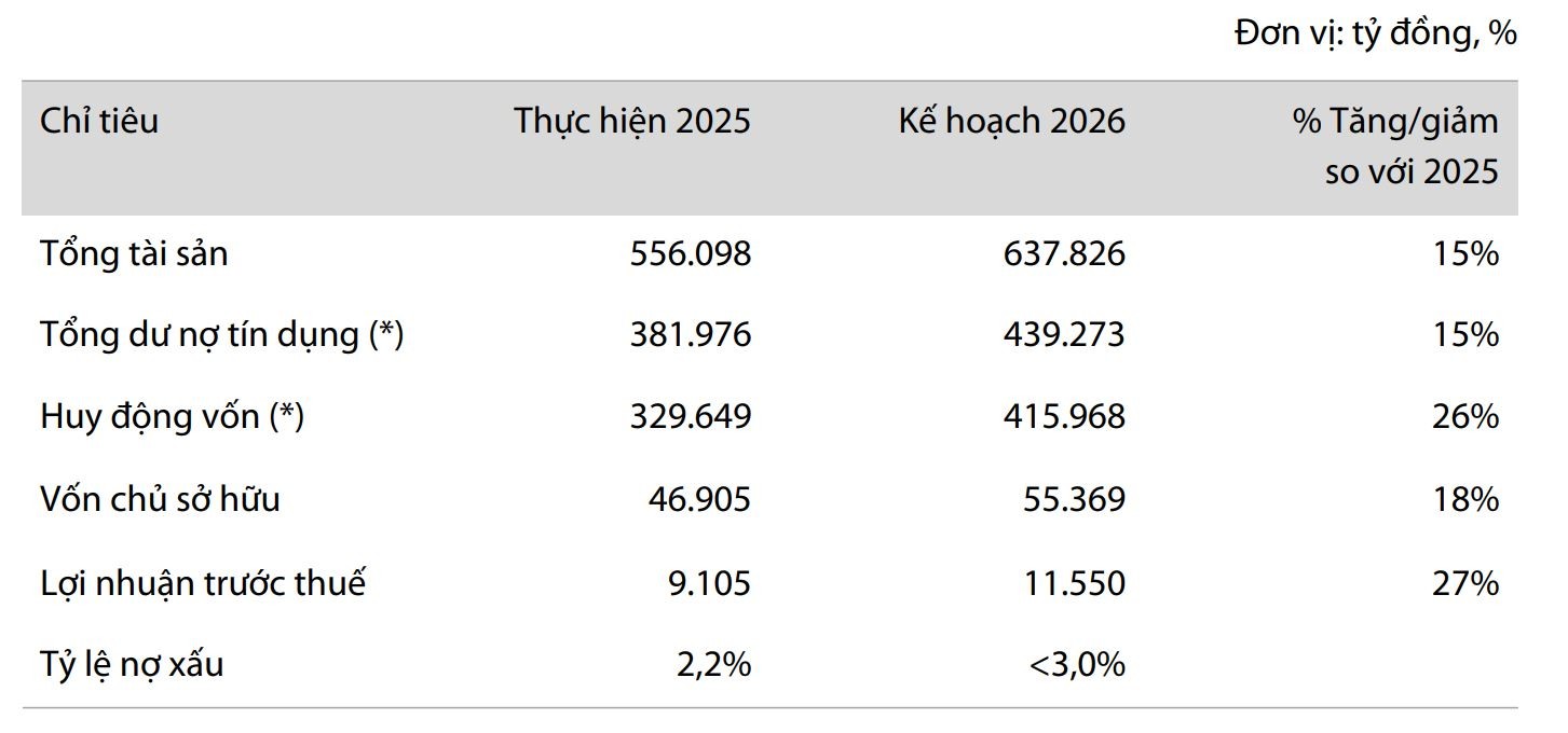 Ngân hàng này đặt kế hoạch tổng tài sản đạt khoảng 637.826 tỷ đồng, tăng 15% so với năm 2025. Dư nợ tín dụng dự kiến đạt 439.273 tỷ đồng, trong khi huy động vốn được kỳ vọng tăng mạnh hơn, lên mức 415.968 tỷ đồng, tương ứng mức tăng 26%. Vốn chủ sở hữu cũng được đặt mục tiêu đạt 55.369 tỷ đồng, tăng 18% so với năm trước.
