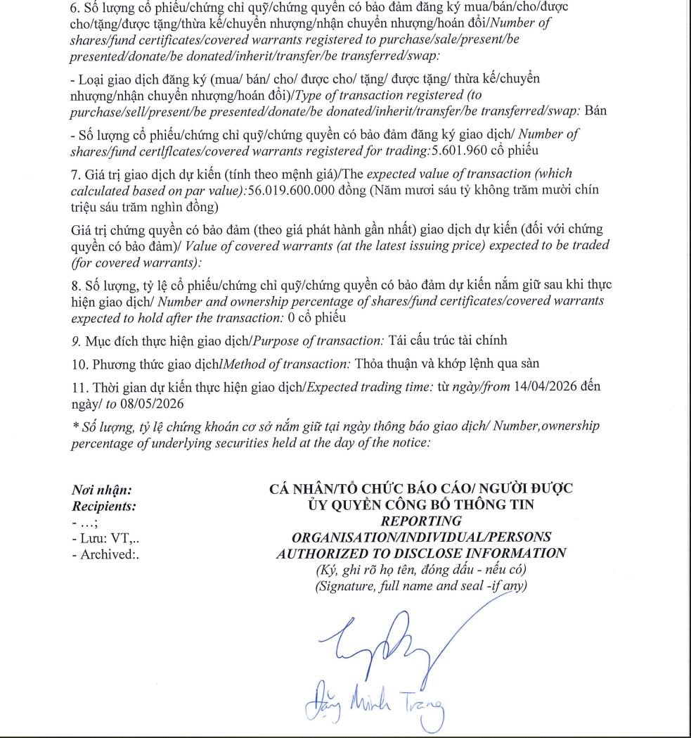 Cụ thể, bà Đặng Thị Thu Hà - vợ ông Đặng Văn Sơn, đã đăng ký mua vào 6 triệu cổ phiếu VIB trong thời gian từ ngày 14/4 đến ngày 18/5/2026 nhằm tái cấu trúc tài chính. Giao dịch dự kiến thực hiện theo phương thức thỏa thuận và khớp lệnh trên sàn.