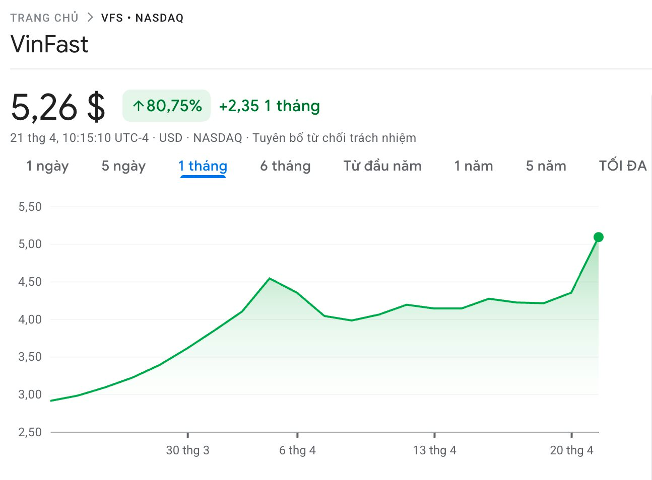 Mở cửa phiên giao dịch sáng 21/4 theo giờ Mỹ, cổ phiếu VFS của VinFast Auto đang giao dịch ở mức 5,26 USD/cp, tăng 0,9 USD, tương đương 20% so với ngày trước đó, tăng gần 80% trong vòng 1 tháng qua.