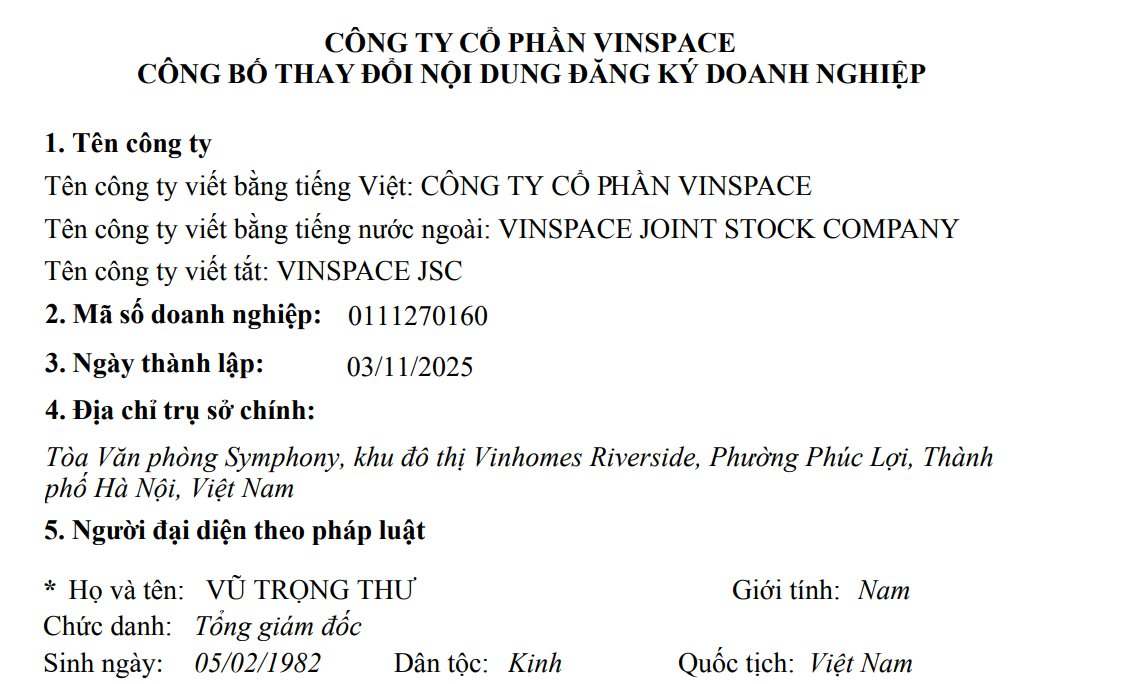 CTCP Vinspace, được thành lập từ tháng 11/2025, vừa có công bố thay đổi nội dung đăng ký doanh nghiệp. Theo đó, Tổng giám đốc là ông Vũ Trọng Thư, sinh năm 1982.