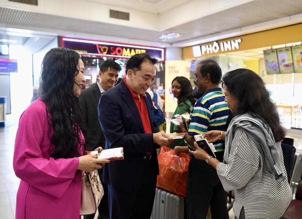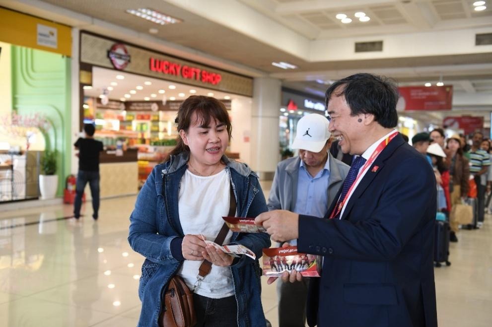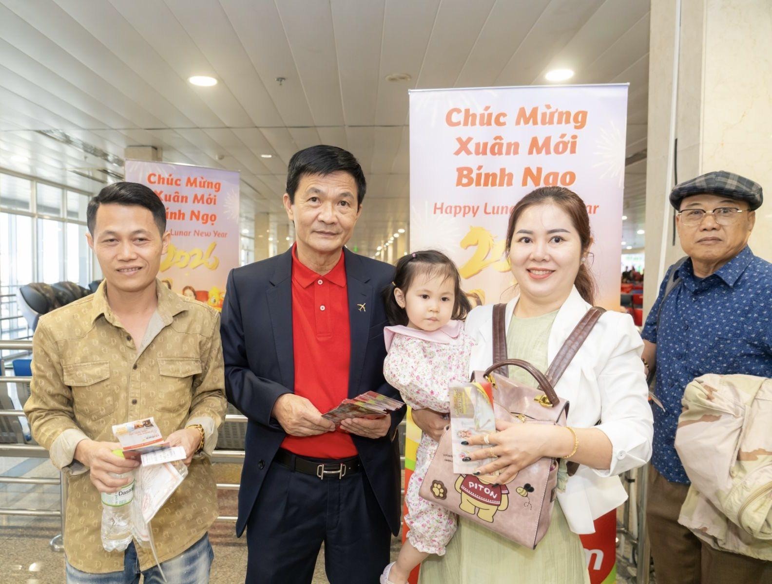 Phó Tổng giám đốc Thường trực Vietjet Tô Việt Thắng, Phó Tổng giám đốc Vietjet Michael Hickey và Giám đốc Khai thác bay Tập đoàn Vietjet Nguyễn Thái Trung đã chào đón những hành khách đầu tiên của năm Bính Ngọ.