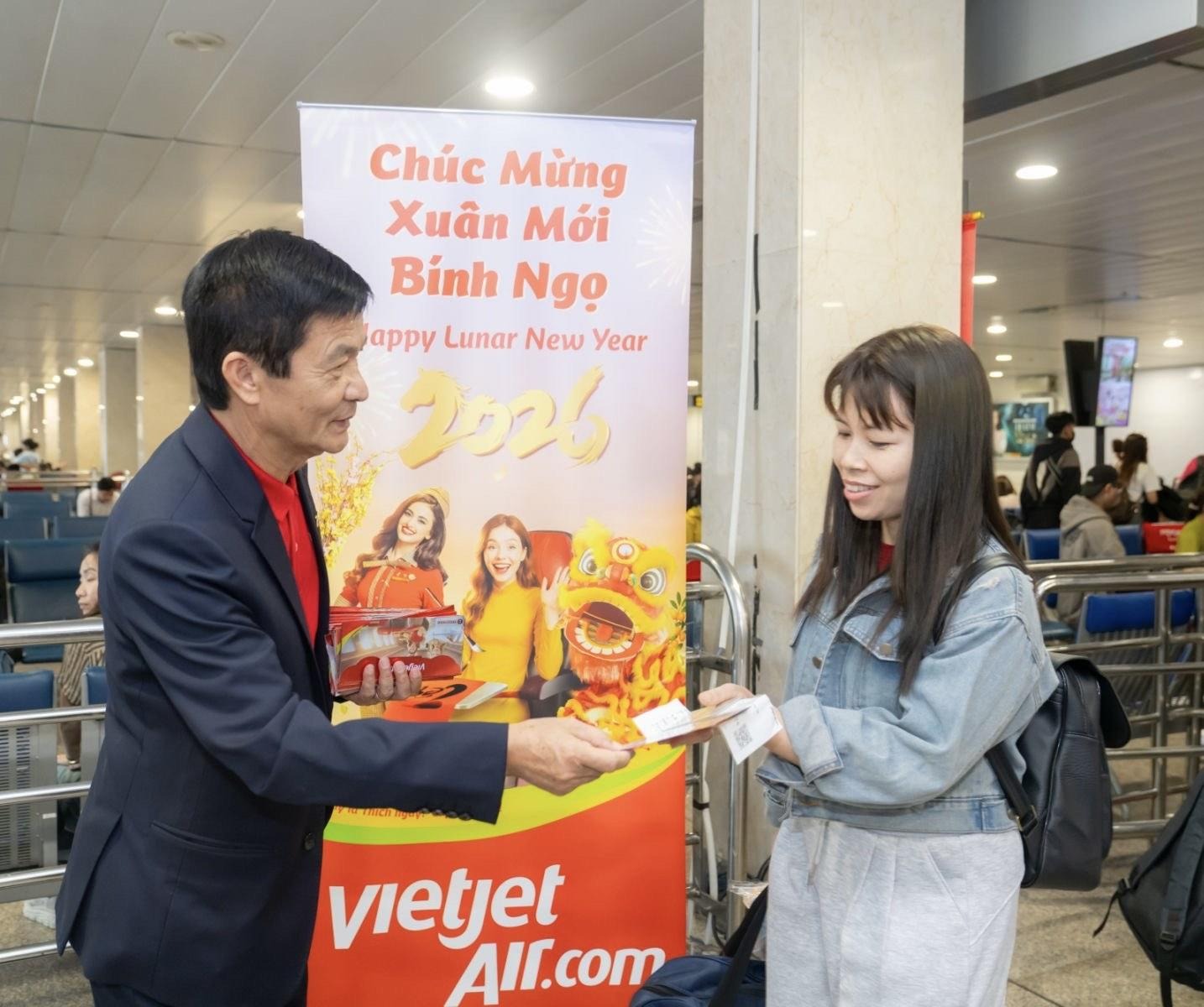 Tại sân bay Nội Bài (Hà Nội), Phó Chủ tịch HĐQT Vietjet Nguyễn Thanh Hà, Phó Chủ tịch HĐQT Vietjet Nguyễn Anh Tuấn, Phó Tổng giám đốc Vietjet Nguyễn Đức Thịnh cùng Tổng giám đốc VJGS Phạm Lê Việt đã trực tiếp gửi lời chúc mừng năm mới an khang, thịnh vượng và trao những phong bao lì xì may mắn tới hành khách xuất hành cùng Vietjet trong ngày đầu tiên của năm Bính Ngọ.