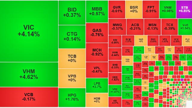 'Kết phiên, VN-Index hình thành nến có dạng pinbar, với phần lớn mức tăng vẫn đến từ một số cổ phiếu vốn hóa lớn như nhóm cổ phiếu Vingroup và ngân hàng.