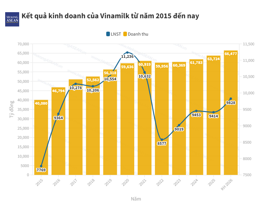 Kết thúc năm 2025, doanh nghiệp đầu ngành sữa Việt Nam đạt 63.724 tỷ đồng doanh thu thuần, tăng 3,1% so với cùng kỳ năm 2024 (YoY); lợi nhuận sau thuế giảm nhẹ 0,4% YoY, xuống còn 9.414 tỷ đồng.
