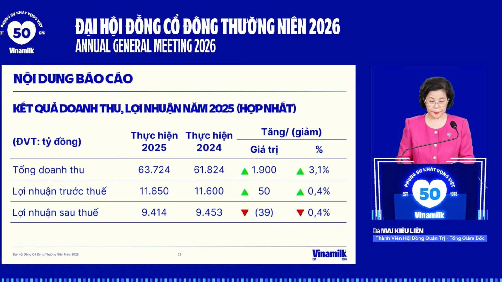 Tổng Giám đốc Mai Kiều Liên cho biết, theo dữ liệu từ Nielsen, tăng trưởng ngành hàng tiêu dùng nhanh (FMCG) trong quí 1-2026 đã cải thiện gần 4,3 điểm phần trăm so với cùng kỳ. Tuy vậy, bức tranh của ngành sữa vẫn chưa thực sự khả quan khi ghi nhận mức giảm 3,7%. Trong bối cảnh các yếu tố bất định, đặc biệt là rủi ro địa chính trị, vẫn hiện hữu, bà cho rằng sức mua của người tiêu dùng khó có thể sớm phục hồi mạnh nếu không xuất hiện những thay đổi đột biến theo hướng tích cực.